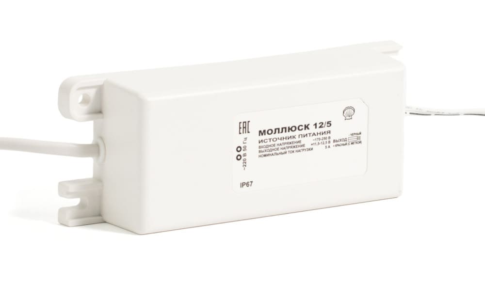 Моллюск 12/5 источник питания 12В, 5А. Сетевой диапазон 170-250В, корпус IP 67