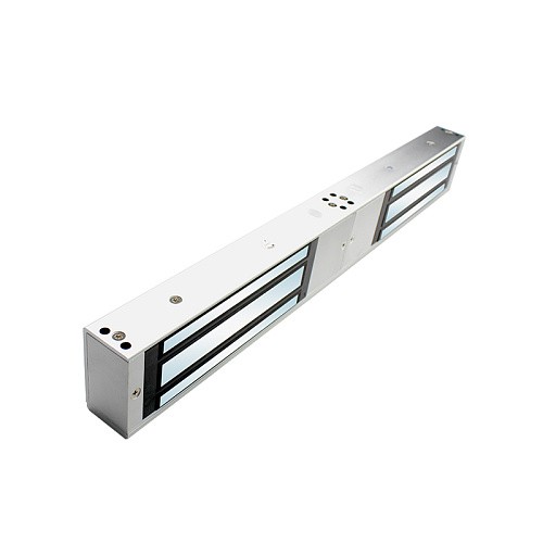 Электромагнитный замок сдвоенный, 12В / 24В DC не более 960мА (12В) / 580мА (24В), усилие 2x500 кг. Мониторинг состояния замка (датчик Холла: реле НО/НЗ/ОБЩ), световая индикация. Двойная система компенсации эффекта остаточной намагниченности (механический компенсатор на якоре замка и специальная плата управления), корпус из анодированного алюминия. Рабочая температура -40°С…+55°С, габаритные размеры 530х72.7х70.7 мм, масса 8.8 кг.