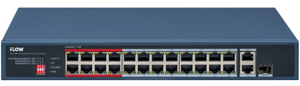 L2, неуправляемый, 24 порта 10/100M RJ45 PoE, 1 uplink порт 1000М RJ45, 1 uplink комбо-порт 1000М (RJ45/SFP), 802.3af/at, бюджет питания PoE 230 Вт, порты 17-24 поддерживают режим передачи до 300м (10 Мбит/с), CAT6; защита от перенапряжения 6 кВ