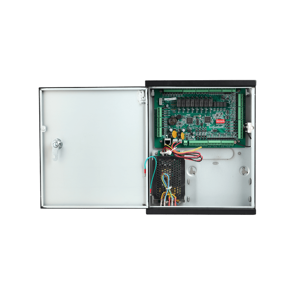 8 считывателей (карты, пароли, отпечатки пальцев); Интерфейс считывателей Wiegand или RS-485; TCP/IP протокол Тревожные вх/вых: 8/4; Защита от двойного прохода, мультидверная взаимоблокировка, мульти-карточная верификация (доступ по нескольким картам) Встроенный источник питания