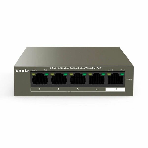 TEF1105P-4-63W - коммутатор Tenda PoE, который имеет 5 портов 10/100 Мбит / Base-TX RJ45. Передача на расстояние до 250 метров. Комутатор имеет молниезащиту по PoE до 6 кВ. Порты 1-4 поддерживают стандарт IEEE 802.3at и IEEE 802.3af PoE. Максимальный выход PoE 30 Вт на один порт и 58 Вт на все устройство. Порты могут использоваться для подачи питания и обмена данными с точками доступа и IP-камерами.