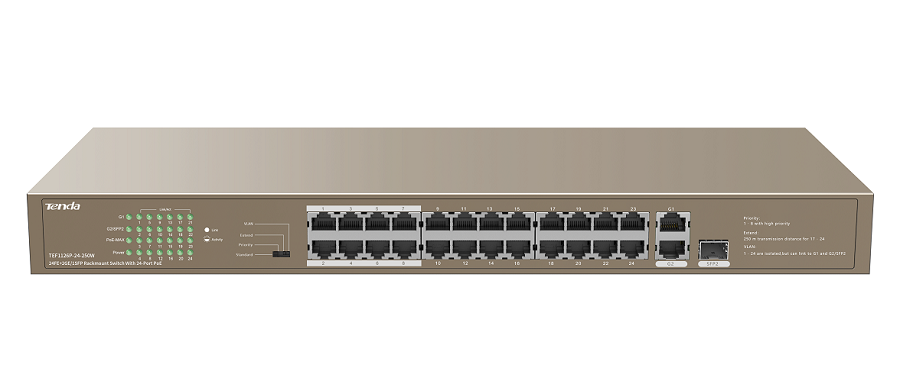 TEF1126P-24-250W TEF1126P-24-250W — это неуправляемый PoE-коммутатор, разработанный Tenda. В соответствии со стандартами IEEE 802.3af и IEEE 802.3at он автоматически идентифицирует устройства с питанием от PoE. С максимальной выходной мощностью PoE 230 Вт и 30 Вт для одного порта он может обеспечивать питание при передаче данных для точек доступа, IP-камер и IP-телефонов. Коммутатор поддерживает 4 режима работы, в том числе стандартный, приоритетный, расширенный и режимы VLAN, и является идеальным выбором для малых и средних предприятий, отелей, школ, заводов с требованиями к видеонаблюдению и беспроводным сетям.