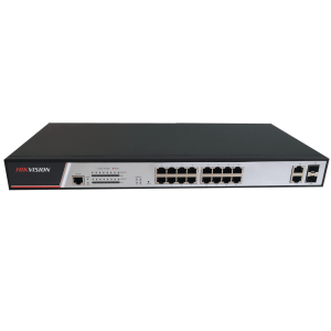 Коммутатор Hikvision 16 RJ45 100M PoE; 2 комбо-порта (1000М Ethernet/1000M SFP); таблица MAC адресов на 8000 записей; стандарты PoE: IEEE802.3af, IEEE802.3at; бюджет PoE 300Вт; AC100-240В; 330Вт; 0 °C...+50°C.