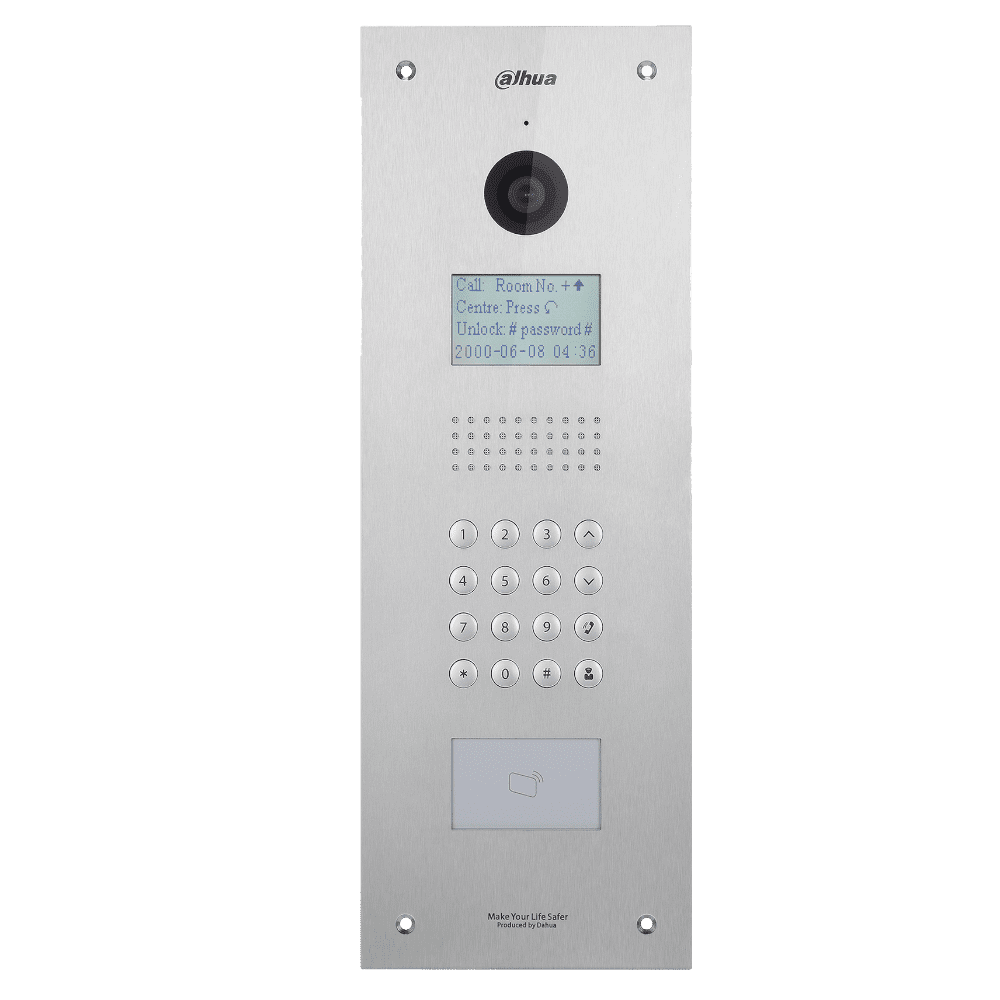 Вызывная панель с разрешением 1.3мп и CMOS сенсором, LCD экран с диагональю 3 дюйма и разрешением 128*64, корпус из нержавеющей стали, поддержка режима "Ночь" и датчика обнаружения, открытие по паролю и карте (Mifare,13.56MHz), групповой вызов, видео и аудио сообщения, уровень защиты IP54, IK07. Питание: DC 12V.